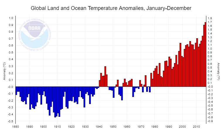 Now peer at that red line a bit—the one showing the running, centered 13-month average. The biggest difference is between one month in 1983, at about 0.35˚C below average, and one month in 2016, at about +0.5˚C above average—a spread of about 0.85˚C (about 1.1˚F).