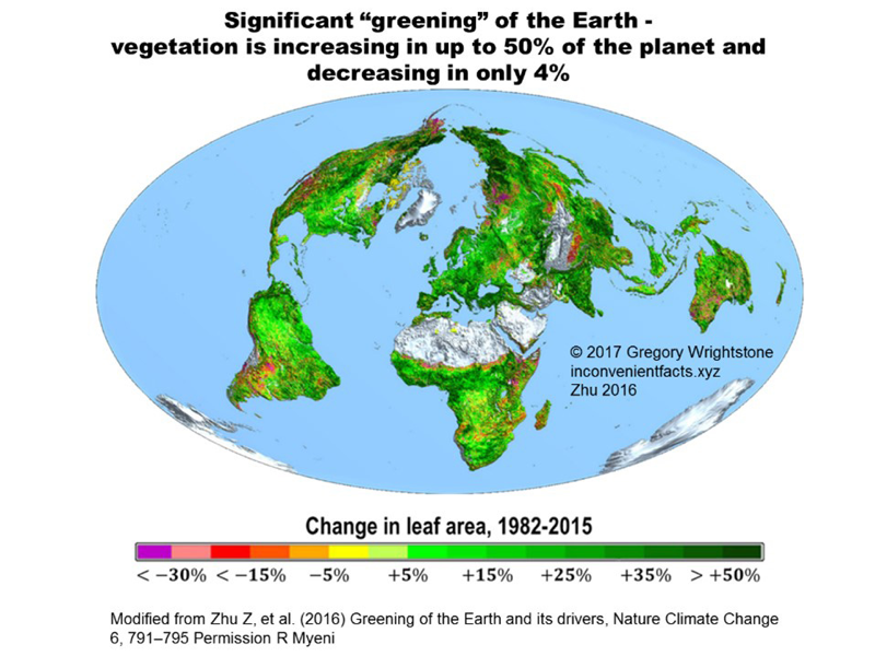 “According to Zhu, 25 to 50 percent of the Earth has increasing vegetation – greening, while only 4 percent shows a net loss – browning. Several factors are contributing to this remarkable planetwide improvement, including CO2 fertilization, soil moisture increase and, to a lesser degree, a retreat of tundra and tree lines owing to the gradual warming,” he said. “One huge story is revealed in the southern Sahara where 300,000 square kilometers of the Sahel region are turning from desert into a lush grassland. Google ‘NASA’ and ‘Greening’ to see for yourself. The NASA experts attribute it to climate change.”
