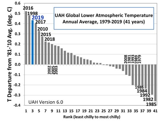 So, I am announcing that in our 41-year record of global satellite measurements of the lower atmosphere, 2019 will come in as 3rd least-chilly.