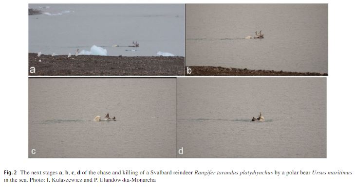 A couple of months ago the journal Polar Biology published a paper about a polar bear’s having chased a reindeer into the sea, caught it, drowned it, dragged the carcass back to land, and feasted on it. “Yes, they can: polar bears Ursus maritimus successfully hunt Svalbard reindeer Rangifer tarandus platyrhynchus” didn’t make a lot of noise at first and probably didn’t deserve to.