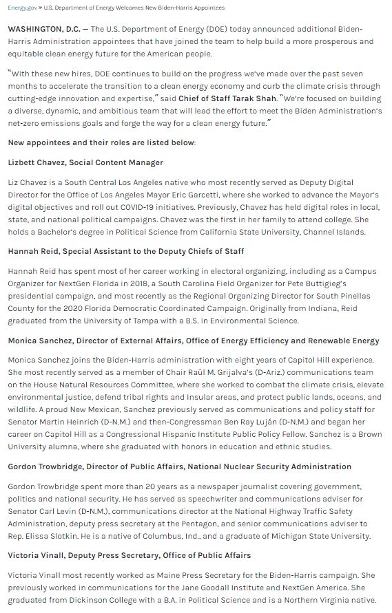 On August 20 the Biden/Harris Administration announced five new appointees to the federal Department of Energy.