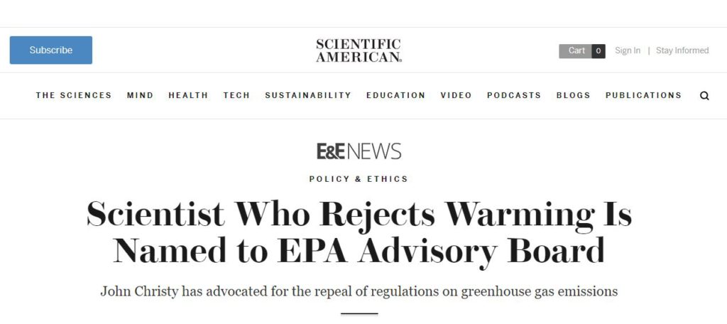 Scientific American, apparently following the lead of E&E News, headlined its report of Dr. John Christy’s appointment to the federal Environmental Protection Agency “Scientist Who Rejects Warming Is Named to EPA Advisory Board.” The truth—which E&E News and SA undoubtedly know, is that John Christy most certainly doesn’t “reject warming.” He manages the NASA satellite data that are our […]