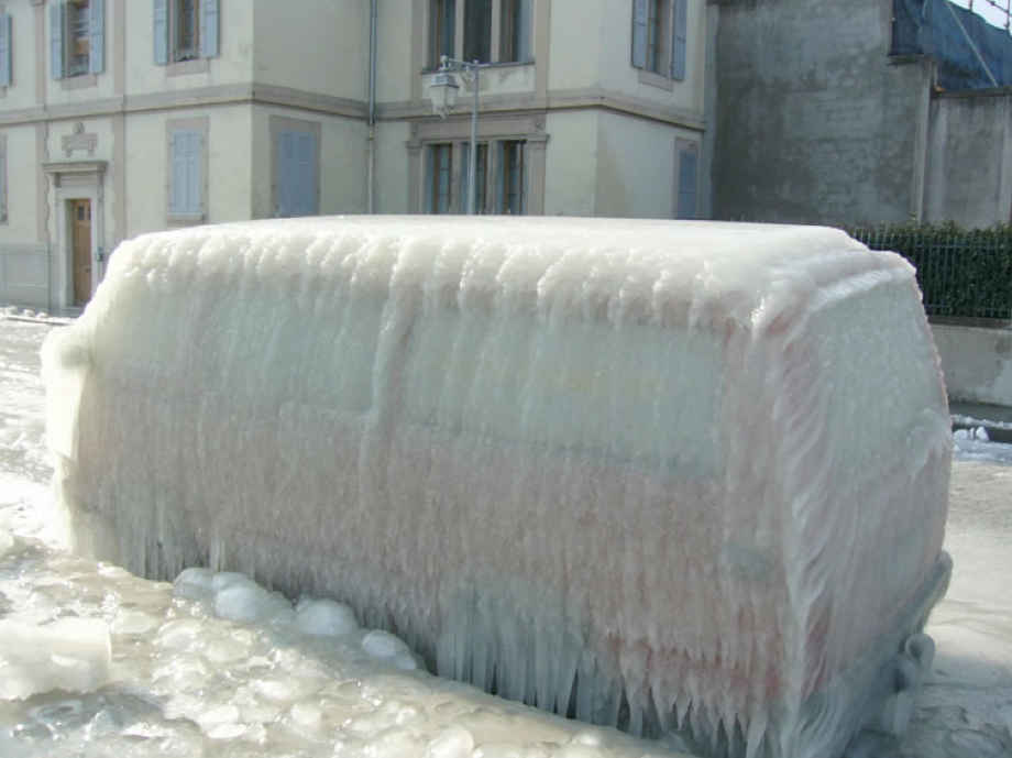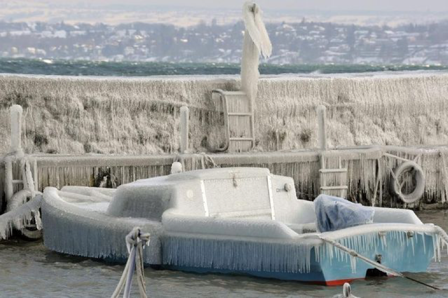 Storms with very cold temperatures – 12 deg C, 10 deg F and 100 kmh, 70 mph winds happen quickly while Lake Geneva is still warm enough to have no ice. Wind whips the lake water up and it freezes instantly on everything it lands on. This has happened in 2018, 2017, 2015, 2012, and 2005 as well as at various times in the distant past. The average annual temperature of Versoix is 9 deg. C, 48 deg. F