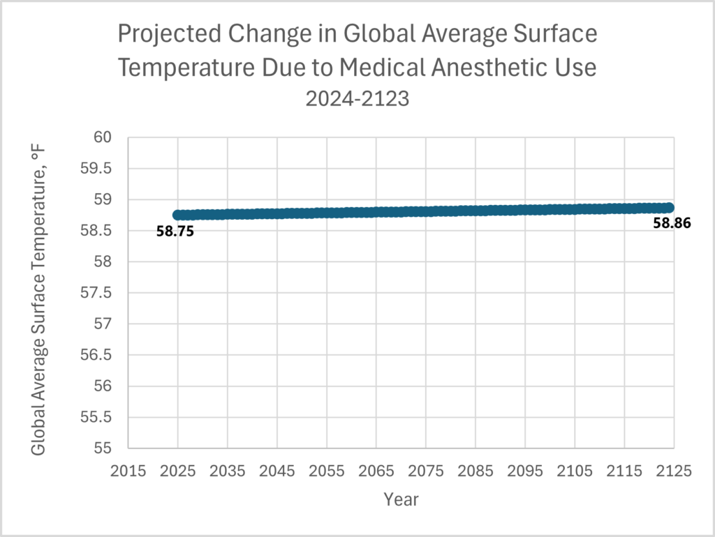 Based on the scientists’ calculations, continued emissions of anesthetic gases would cause a temperature increase of about 0.032 °C in 50 years and of about 0.064 °C (0.117 °F) in 100 years.