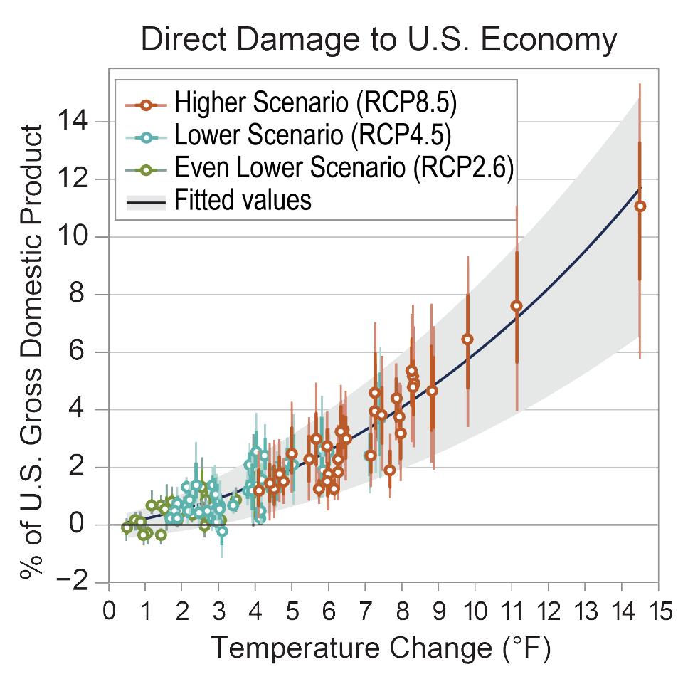 This caveat notwithstanding, one may hypothetically consider a case where predictions made by the 4NCA are assumed to be usefully accurate. In particular, the report’s predictions for global temperature rise and consequential effects on U.S. gross domestic product (GDP) can be used to evaluate the potential value of a climate change solution.