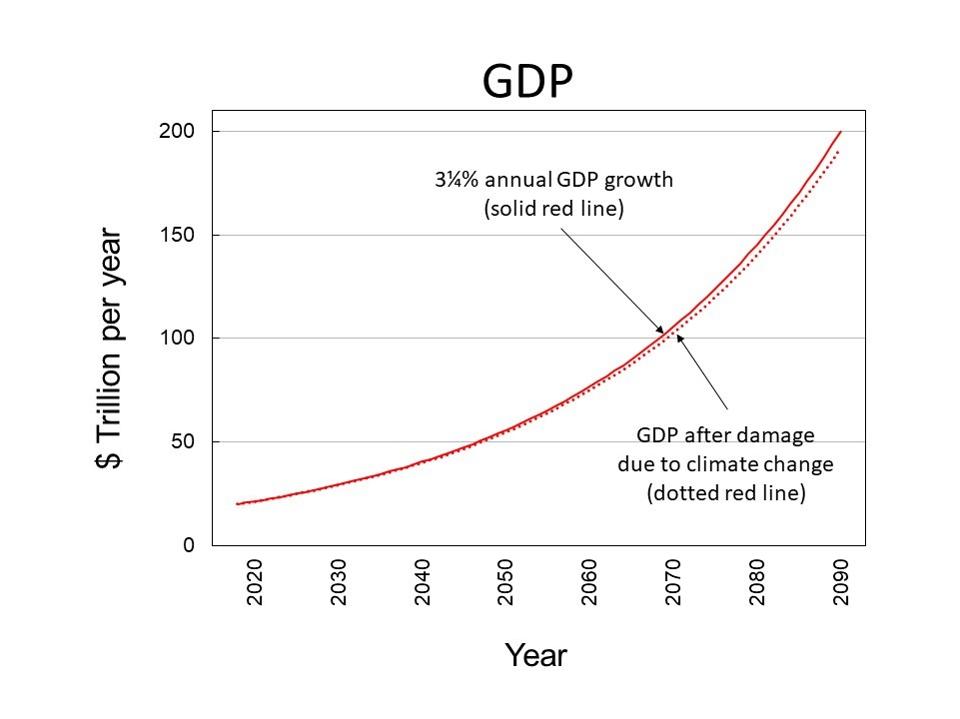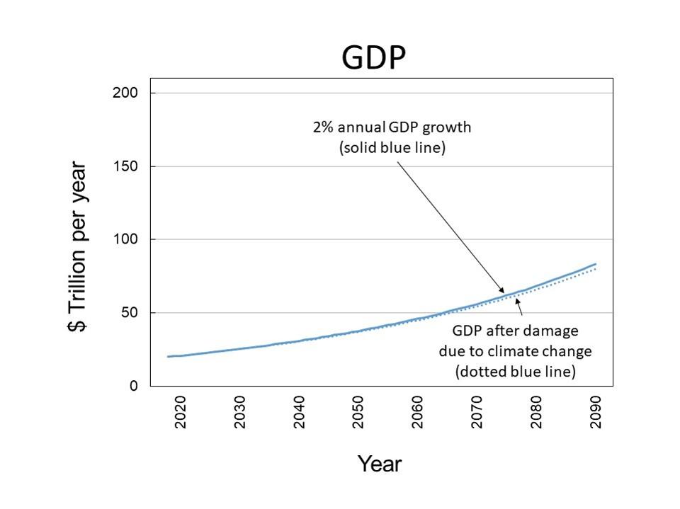 The blue solid line in figure 4 illustrates 2% annual GDP growth. Rates of growth near this value have been described as “the new normal” by political economists favoring low-growth policies. In this case, GDP grows from about $20 trillion to about $83 trillion. The predicted losses due to climate change reduce the 2090 GDP by 4%, to about $80 trillion. Even this economy is four times bigger than today.