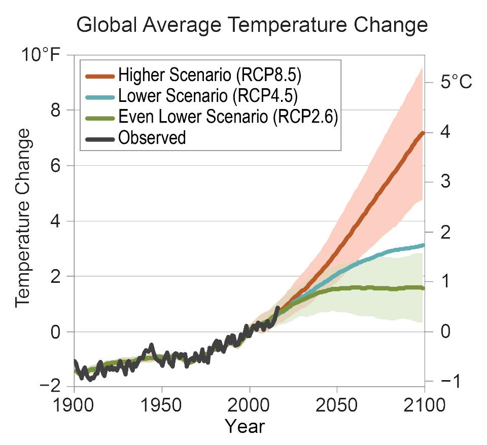 The 4NCA predicts an increase in global average temperatures by 4.2o to 8.5o F (2.4o to 4.7o C), relative to the 1986-2015 average, for the years around 2090 under the RCP8.5 scenario. The burnt orange shaded area in Figure 1 (taken from the 4NCA) illustrates this prediction. RCP stands for “Representative Concentration Pathways”, and the RCP8.5 scenario is the so-called “worst case” scenario where fossil fuel use continues unimpeded and no extraordinary efforts are made to counter growing CO2 emissions.