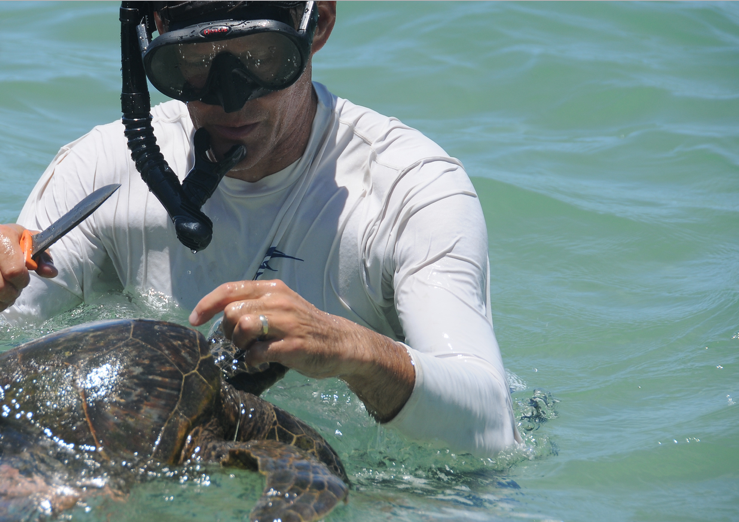 When I surf, turtles occasionally surface in my path, and I lean over and glide my hand across their carapace to avoid a collision. On rare occasions, we spot them hopelessly entangled in fishing line. Donning masks, snorkels, and knives, we rush out to cut them free.