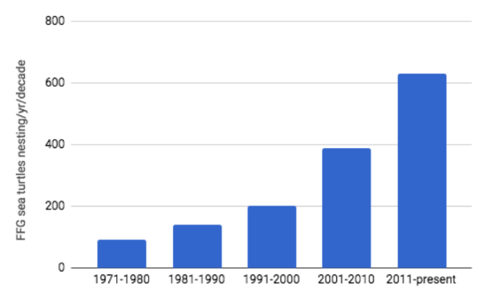While the sea turtle increases at FFG are impressive, it’s important to note this series of islets has a total land area of only 61.5 acres. While important in its own tiny way, it would be foolish and unscientific to extrapolate the trends on this speck of land to sea turtle populations worldwide. For that, we turn to a recently published research article titled Global Sea Turtle Conservation Successes. Studying 299 time-series similar to the graph above, the scientists found that, globally, 95 showed significant increases, while only 35 showed significant decreases. A large part of this global conservation success story is because, since the 1970’s, humans have made great efforts to steward local turtle populations. Techniques for collection and incubation of sea turtle eggs have improved. Important nesting areas like FFG are now protected and monitored. Shrimp trawlers in the U.S. and elsewhere now use TEDs (turtle excluder devices) to avoid turtles and other unwanted bycatch.