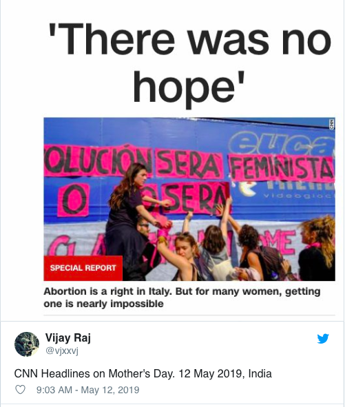 The article talked of the difficulty in getting an abortion in Italy. CNN followed that with an article reporting on why the woman who invented Mother’s Day now regrets it.