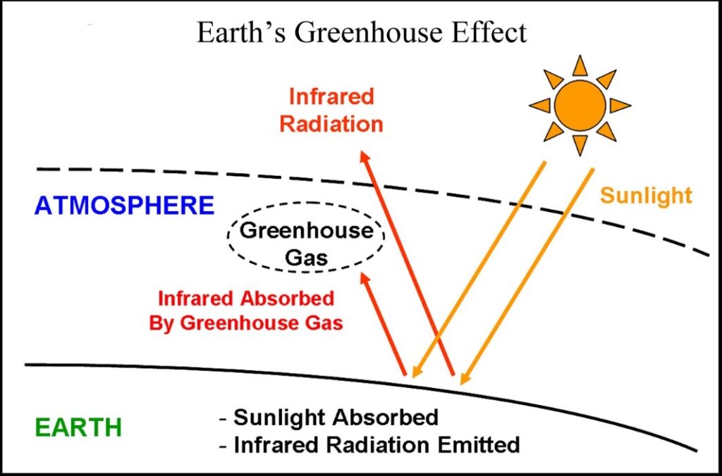 Methane is a greenhouse gas and part of Earth’s greenhouse effect, which is blamed for global warming. Sunlight, which is high-energy radiation, enters the atmosphere and is absorbed by Earth’s surface. Like any warm body, Earth emits radiation. Since Earth’s temperature is lower than that of the sun, Earth emits lower-energy radiation called infrared radiation or longwave radiation, which is not visible to our eyes.