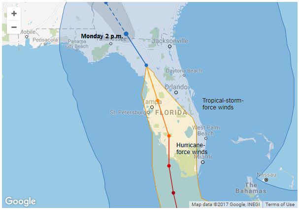 But because Irma’s eye stayed inland, she rapidly lost strength, declining to tropical storm force about halfway from Tampa to the Georgia state line.