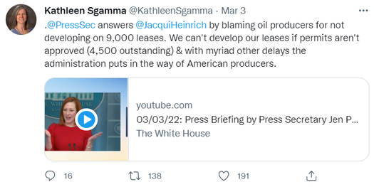 On March 3rd, White House Press Secretary Jen Psaki, in response to a question about increasing domestic oil production, attempted to shift blame to oil companies by citing “9,000 approved oil leases that the oil companies are not tapping into currently.” In subsequent press conferences, she adjusted that to 9,000 permits and went on a Twitter storm to shift blame.