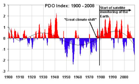 As it turns out, that’s the case. Arctic sea ice extent has little correlation with global average temperature. But it correlates just fine with ocean and wind cycles.