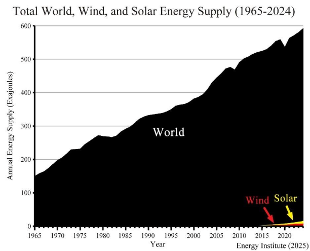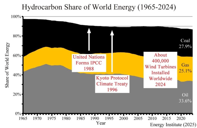 What have thirty UN climate conferences accomplished since 1995? The answer is “no measurable climate benefit.” Since 2000, the world has spent about $10 trillion on renewable energy, but hydrocarbons─coal, natural gas, and oil─still provided 87% of world energy in 2024 according to the Energy Institute.
