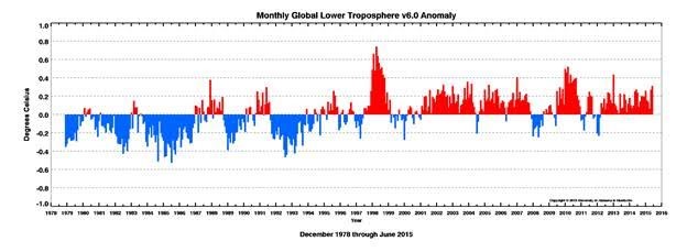 First, have I cherry-picked data? No. I’ve taken the entire period of satellite data record. There are no satellite data earlier than that. And the satellite data are the most comprehensive and reliable we have, because they’re not contaminated by the quite significant differences in equipment, siting, and maintenance that contaminate the land-surface and ocean-surface data.