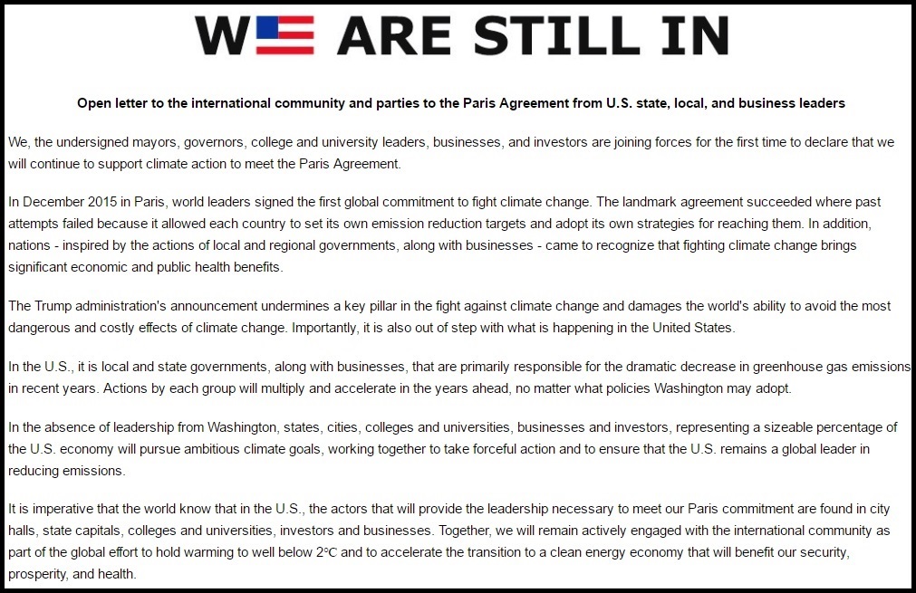 And what does it mean to be “Still In”? It means those states, counties, cities, colleges, businesses, and investors say they’ll “pursue ambitious climate goals.”